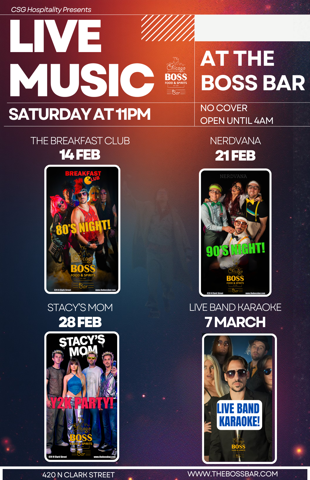 The Boss Bar was established in 1987. We are located at the corner of Clark and Hubbard in Chicagoβs premier River North neighborhood.